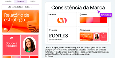 Centralize logos, cores, fontes e templates em um só lugar. Com o Canva Enterprise, você mantém a consistência visual da sua marca em todos os materiais, evitando erros e garantindo que cada campanha, apresentação ou publicação reflita fielmente a identidade corporativa.
