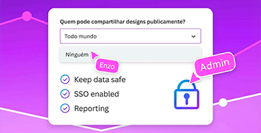 Tenha total controle sobre permissões de acesso, fluxos de aprovação e compliance de TI. O Canva Enterprise oferece segurança de nível corporativo, permitindo que gestores acompanhem cada projeto e garantam que informações e ativos estratégicos estejam protegidos e organizados.